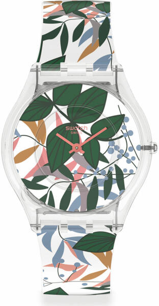 Swatch Leaves Jungle női karóra SS08K111 egy kerek formájú, átlátszó színű bio műanyag óratokkal, színes analóg számlappal és színes szilikon szíjjal rendelkező divatos Swatch karóra. Az óra elemmel működő kvarc szerkezettel és 3 ATM vízállósággal rendelkezik, tehát cseppálló. Ez a fantasztikus óra most 45900 áron megrendelhető webshopunkban, melyre 24 hónap gara