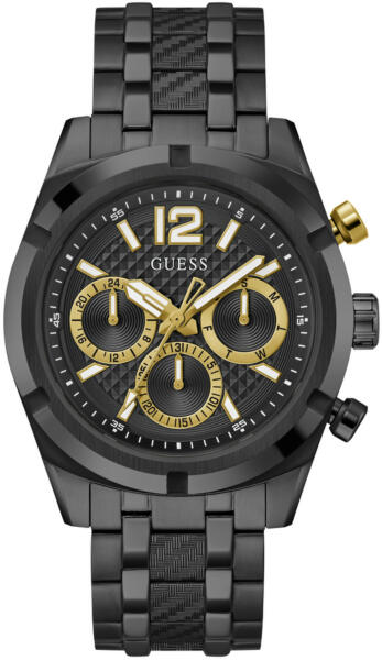 Eredeti Doboz, Pontos óraszerkezet , Kiváló minőségű anyagok, kifinomult tervezés 2év Magyar jótállás, 15 napos pénzvisszafizetés gyártó: Guess ModellNr : GW0714G4 ehemalige Listaár:*: 259,00 Euro számlap: analóg, szín: fekete Ház: Rozsdamentes acél tokfekete átmérő ca. 44,0 mm (nélkül korona), magasság ca. 10,7 mm Óralap: Rozsdamentes acél a gyártó logójával kark