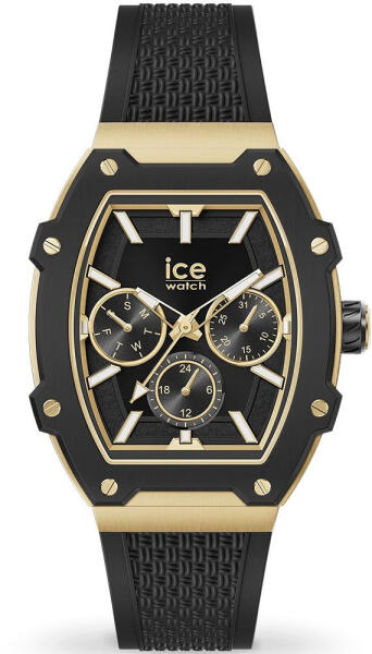 Az Ice Watch Boliday Black Gold női karóra 35mm 022865 karóra házának anyaga Alumínium, színe Arany, Fekete, a szíjának anyaga Szilikon és a színe Fekete. Az óratok átmérője 35 mm, alakja Elliptikus. A karóra üvege Kristály (nehezen karcolható), szerkezete Kvarc és vízállósága 5 atm (50m) (erősen cseppálló).
