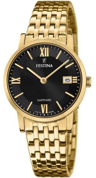 Az időtlen Festina óra világos számlapjával ideális kiegészítője mind a hivatalos, mind az alkalmi öltözékeknek . Ez a kerek, acél tokkal ellátott karóra kvarc (elemes) mechanizmussal működik, 3 óránál dátumkijelzővel. A fekete számlapon az időt római számokkal kiegészített arany indexek mutatják. A számlapot lapos zafírüveg borítja, és az 50 M-es vízállóságna
