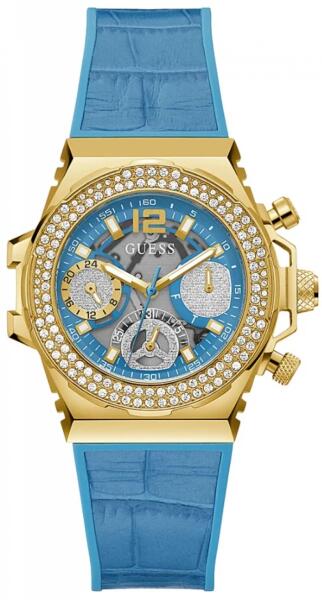 Guess női karóra típusa GW0553L3. A sport és a divat ötvözete egyesül ezzel a lenyűgöző sziluettel, teljes dupla kristálysorral, átvágott, krono megjelenésű, többfunkciós funkcióval, csillogó részletekkel a számlapon, valamint krokó-dombornyomott bőrrel és szilikonon.