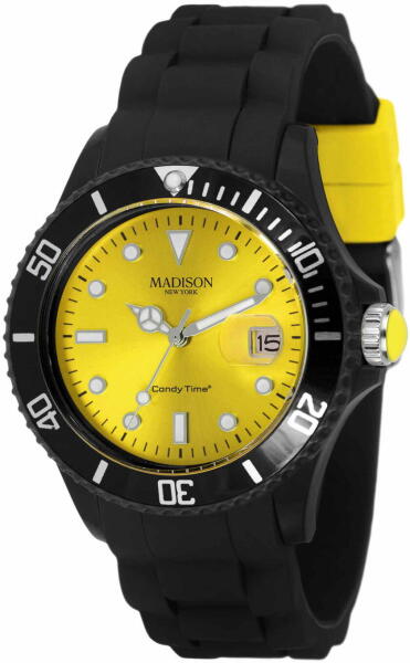 MADISON New York, fekete-sárga, szilikonszíjas, cseppálló, dátumkijelzős uniszex karóra (40 MM), 5 ATM. Olyan hölgyek és urak figyelmébe, akik szeretik magukra felhívni a figyelmet a kiegészítőkkel is, és nem szeretnek beleolvadni a tapétába egy házibulin, vagy bárhol. Jó értelemben az exhibicionizmusra kissé hajlamos, extravagáns lelkivilágú lányoknak, asszonyoknak, és