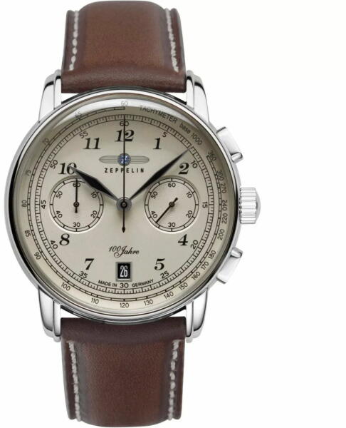 Zeppelin 100 Jahre férfi karóra típusa 7674-6. A férfi Zeppelin 100 Jahre Chronograph 7674-6 karóra szokatlan retro stílust mutat be. A bézs színű számlapot a hónap napjának dátuma, kronográfja és fordulatszámmérője egészíti ki, és edzett K1 ásványi üveg védi. A Super-LumiNova lumineszcens bevonat lehetővé teszi az idő kényelmes leolvasását sötét helyeken. Az óra