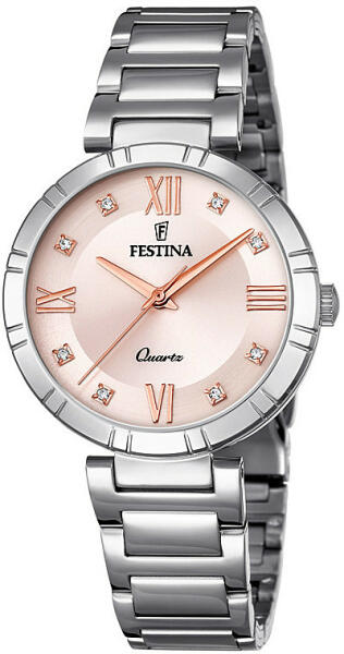 A Festina női karóra divatos kialakításával ideális kiegészítője a társasági és alkalmi öltözékeknek. Különleges acél házzal ellátott óra, kvarc (elemes) óraművel. A rózsaszín számlapon az időt római számokkal kombinált indexek mutatják. A számlapot sima ásványi üveg borítja. Az 50M vízállóság biztosítja, hogy az óra vízálló legyen, ha ráfröccsen vala