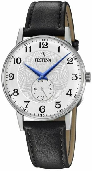 Az elegáns, időtlen megjelenésű Festina órák ideális kiegészítői mind a társasági, mind az alkalmi öltözékeknek. Ez a kerek, acél tokkal ellátott társadalmi óra kvarc (elemes) óraművel és egy atipikusan elhelyezett másodpercmutatóval rendelkezik 6 óránál. A fehér számlapon az időt fekete arab számok és egy jellegzetes kék mutató jelzi. A számlapot lapos akrilüve
