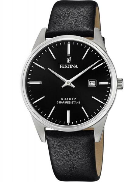 Az időtlen Festina óra világos számlapjával ideális kiegészítője mind a hivatalos, mind az alkalmi öltözékeknek . Ez a kerek, acél házzal ellátott óra kvarc (elemmel működő) mechanizmussal működik, dátumkijelzővel. A fekete számlapon az időt ezüst indexek mutatják. A számlapot lapos ásványi üveg borítja. Az 50 M-es vízállóság biztosítja, hogy az óra vízálló