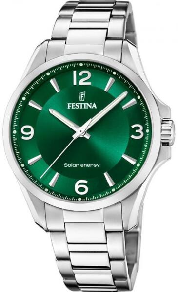 A Festina óra kör alakú, sebészeti acélból készült tokkal rendelkezik, a pontos működést pedig egy megbízható Miyota óramű biztosítja. Az órát a napenergia-rendszer működteti (napfényt vagy mesterséges fényt használ a működéséhez). A felesleges napenergiát egy akkumulátor tárolja, amely akár 6 hónapos üzemidőre elegendő tartalékot hoz létre. A zöld számlapon