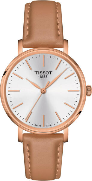 Tissot Everytime Lady női karóra T143.210. 36.011. 00 egy kerek formájú, rosegold színű nemesacél óratokkal, ezüst analóg számlappal és barna valódi bőr szíjjal rendelkező divatos Tissot karóra. Az óra elemmel működő kvarc szerkezettel és 5 ATM vízállósággal rendelkezik, tehát mérsékelten vízálló. Ez a fantasztikus óra most 125900 áron megrendelhető webshopunkban