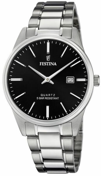 Az időtlen Festina óra világos számlapjával ideális kiegészítője mind a hivatalos, mind az alkalmi öltözékeknek . Ez a kerek, acél tokkal ellátott karóra kvarc (elemes) mechanizmussal működik, 3 óránál dátumkijelzővel. Az időt az ezüst számlapon római számokkal kiegészített arany indexek mutatják. A számlapot lapos zafírüveg borítja, és az 50 M-es vízállóságn