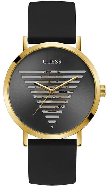 Férfi Guess GW0503G1 karóra műanyag szíjjal. Egyszerű kijelző indexek nélkül. A Guess Idol karóra tökéletes az elegancia és a minimalizmus kedvelőinek. Az aranyozott acél tok PVD felületkezelésen esett át, amely az ásványi üveggel együtt megvédi az órát a sérülésektől. Az egyszerű kijelzőt egy minimalista geometrikus motívum egészíti ki magával a márkanévvel egy