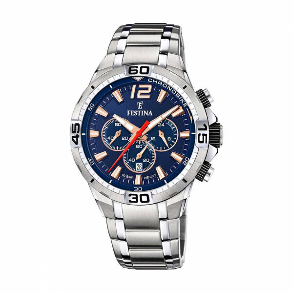 Kvalitné pánske hodinky Festina 20522/4 z kolekcie Chrono Bike. Tento model má okrúhle puzdro s priemerom 44 mm a hrúbkou 13 mm. Hodinky majú funkciu dátum a stopky. Model Festina 20522 je veľmi obľúbený, ponúka moderným mužom možnosť doplniť outfit štýlovým módnym doplnkom. Disponujú minerálnym sklom a spoľahlivým mechanizmom poháňaný batériou, ktorý je zárukou pres