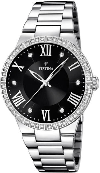 A Festina karóra divatos dizájnnal ideális kiegészítője a társasági és alkalmi öltözékeknek. Társadalmi óra kerek, acél házzal, tiszta cirkonokkal díszített, kvarc (elemes) óraművel. A fekete számlapon az időt római számokkal kombinált indexek mutatják. A számlapot sima ásványi üveg borítja. Az 50M vízállóság biztosítja, hogy az óra vízálló legyen, ha ráfr