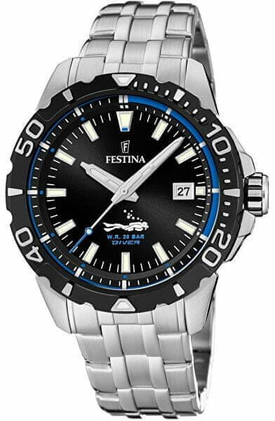 Sport Festi na karórák a Diver kollekcióból. Ideális kiegészítők férfiaknak , akik előnyben részesítik az analóg és kerek alakú karórákat. A belül ellenálló 13 mm magas tokban, melyet minőségi acél alkot , megbízható elemes (quartz) gépezetet talál, mely 45 mm átmérőjű számlapot működtet. A számlapot ellenálló ásványi üveg véd. A tok ezüst, számlap fekete