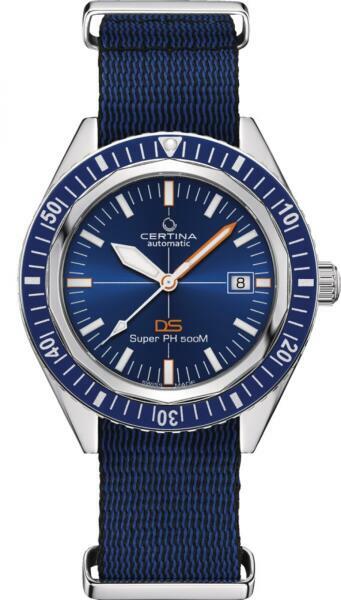 Certina DS PH500M STC SPECIAL EDITION férfi karóra C037.407. 18.040. 10 egy kerek formájú, ezüst színű nemesacél óratokkal, kék analóg számlappal és kék textil szíjjal rendelkező divatos Certina karóra. Az óra mechanikus (automata) szerkezettel és 20 ATM vízállósággal rendelkezik, tehát búvárkodásra megfelelő. Ez a fantasztikus óra most 399900 áron megrendelhető webs