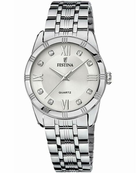 A női karóra Festina időtlen dizájnnal ideális kiegészítője mind a társasági, mind az alkalmi öltözékeknek. Karóra díszített, acél tokkal, kvarc (elemes) óraművel . Az ezüstözött számlapon az időt csillogó cirkónia és ezüstszínű római számok jelzik. A számlapot lapos ásványi kristály borítja, és az 50M vízállóság biztosítja, hogy az óra vízálló legyen