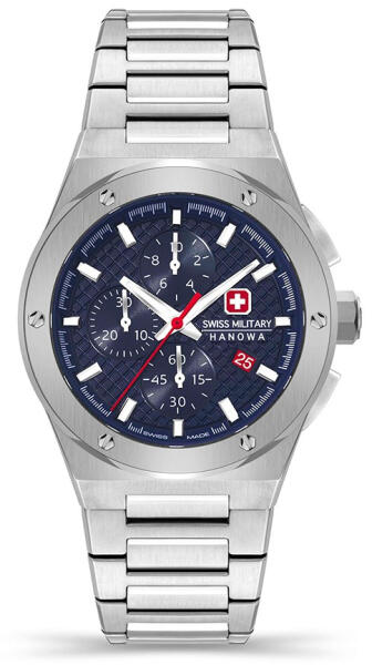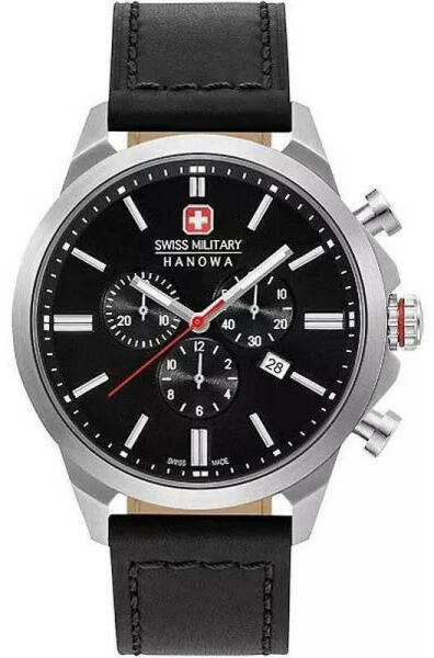 Swiss Military Hanowa Chrono Classic Ii férfi karóra 06-4332.04. 007 egy kerek formájú, ezüst színű nemesacél óratokkal, fekete analóg számlappal és fekete valódi bőr szíjjal rendelkező sportos Swiss Military Hanowa karóra. Az óra elemmel működő kvarc szerkezettel és 10 ATM vízállósággal rendelkezik, tehát fürdésre, úszásra használható. Ez a fantasztikus óra most