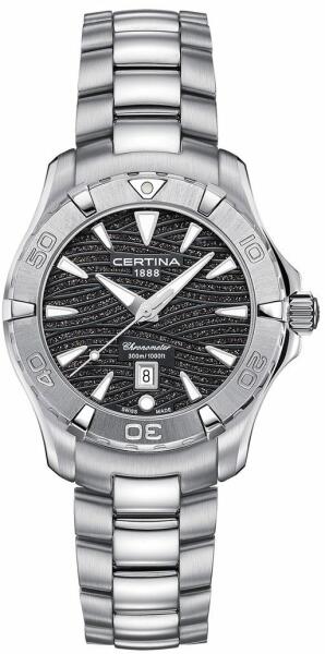 Certina DS ACTION Lady női karóra C032.251. 11.051. 09 egy kerek formájú, ezüst színű nemesacél óratokkal, fekete analóg számlappal és ezüst nemesacél szíjjal rendelkező divatos Certina karóra. Az óra elemmel működő kvarc szerkezettel és 20 ATM vízállósággal rendelkezik, tehát búvárkodásra megfelelő. Ez a fantasztikus óra most 239900 áron megrendelhető webshopunkb
