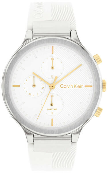 Ez egy Calvin Klein márkájú, CK25200244 típus számú, Energize női karóra. A tokjának anyaga nemesacél, a szíja műanyagból készült. Az óratok mérete 40 mm, üvege kristály és vízállósága 30 m. Az óra quartz szerkezettel ellátott. analóg szerkezet