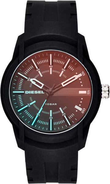 Óra kollekció Diesel. Kerek tárcsás modell, műanyag szíj. - Tok anyaga : műanyag - Tok alakja: kerek - Szíj anyaga: műanyag - Vízállóság: WR. 100M (10 ATM) - úszni lehet vele, merülni nem (aqualung). - Üveg: ásványi (edzett, rendkívül ellenálló a törésre, nehéz megkarcolni). - Mechanizmus: kvarc, elemmel működik - Tok szelessége: 44 mm. - Tok vastagsága: 12 mm. - Öv s