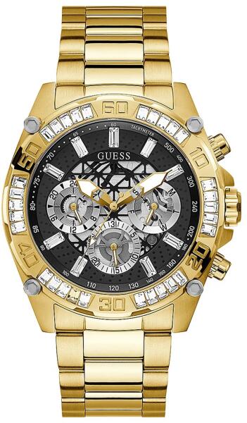 Eredeti Doboz, Pontos óraszerkezet , Kiváló minőségű anyagok, kifinomult tervezés 2év Magyar jótállás, 15 napos pénzvisszafizetés Guess Trophy férfi óra karóra GW0390G2 Multifunctional nemesacél tok, arany bevonat, csiszolt / matt nemesacél szíj, arany bevonat, csiszolt / matt, összecsukható kapocs Quartz szerkezet, elemes naptári nap kijelző, dátumkijelzés, 24 órás kije