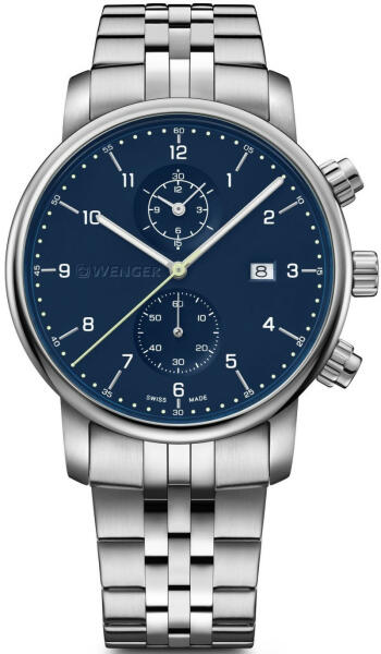 Wenger Urban Classic Chrono 01.1743. 124 férfi karóra. Super-LumiNova® bevonatú mutatók melyek még éjszaka is jó olvashatóságot biztosítanak Rozsdamentes 316L acél óratok, menetes hátlap Svájci gyártású karóra Ronda 3520. D kvarc szerkezet Karcálló kupolás kristályüveg zafír bevonattal 100 M vízálló 3 év garancia