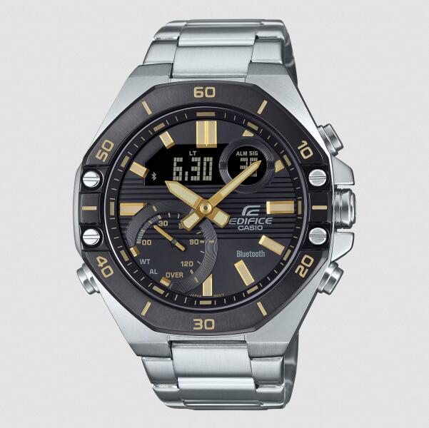 Casio Edifice férfi karóra típusa ECB-10DB-1A9EF. Smartphone Link | Nyolcszögletű előlappal rendelkező okostelefon-link modell az EDIFICE-től, amely folyamatosan fejlődik, mint egy fejlett, nagy teljesítményű fém kronográf. Amíg az óra közel van egy okostelefonhoz, a Smartphone Linken keresztül Bluetooth®-on keresztül kapcsolódhat a dedikált „CASIO WATCHES alkalmazáshoz,