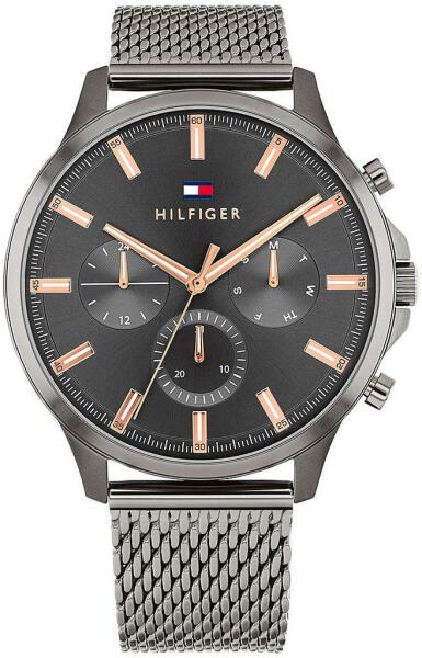 Leírás: Márka: Tommy HilfigerGarancia 2 évTápellátás: kvarc elemVízállóság: 50M/5ATMÜveg: ásványiMegnevezés: férfiSzíj anyaga: rozsdamentes acélA tok színe: szürkeA ház anyaga: rozsdamentes acélSzámlap színe: szürkeForma: kerekTok vastagsága: 12 mmA ház átmérője: 44 mm