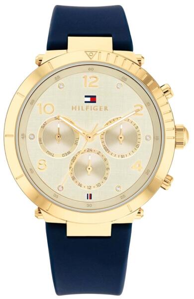 Tommy Hilfiger Emery Le női óra TH1782491, aminek a cikkszáma TH1782491, most 61655-ért elérhető webshopunkban. Az óratok kerek, anyaga nemesacél, színe arany. A számlapja arany. Szíjának anyaga szilikon, színe kék, elemmel működő kvarc szerkezettel rendelkezik. 50 méterig vízálló, így mérsékelten vízálló. Szerintünk egy divatos stílusú karóra. A termékre 24 hónap
