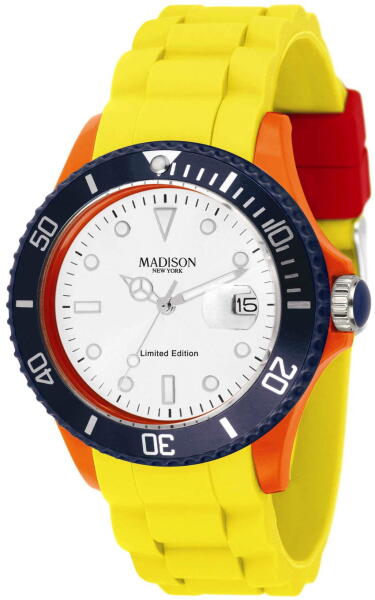 MADISON New York, sárga-fekete szilikonszíjas, cseppálló, dátumkijelzős uniszex karóra (40 MM), 5 ATM. Olyan hölgyek és urak figyelmébe, akik szeretik magukra felhívni a figyelmet a kiegészítőkkel is, és nem szeretnek beleolvadni a tapétába egy házibulin, vagy bárhol. Jó értelemben az exhibicionizmusra kissé hajlamos, extravagáns lelkivilágú lányoknak, asszonyoknak, és