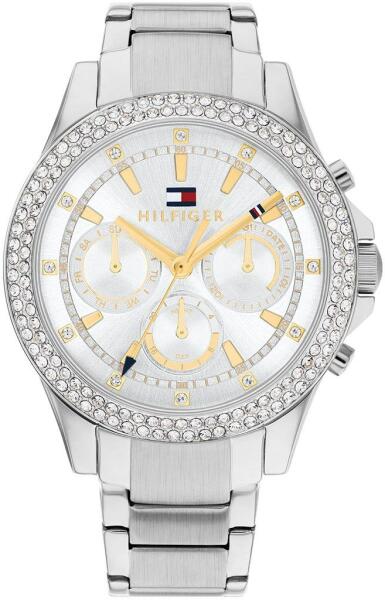 Tommy Hilfiger női karóra típusa 1782677. A 38 mm-es tokátmérővel, 10,2 mm-es házvastagsággal és 18 mm-es szalagszélességgel büszkélkedő óra egy érintetlen ezüst számlappal és egy rozsdamentes acél szíjjal rendelkezik. Az ásványkristály és a 30 m vízállóság révén ez a gyönyörű óra egy nyomógombos rögzítőcsattal van kiegészítve.