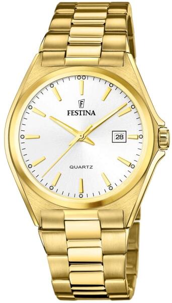 A Festina 20555/2 férfi karóra tökéletesen kiemelkedik a csuklóján. A modell arany színű kialakítása könnyen illeszthető a különböző öltözékekhez. Az óra kiváló minőségű rozsdamentes acélból készült, amely megvédi az órát a sérülésektől. A kerek, masszív lünettával ellátott tokot masszív ásványi kristály védi. A kijelzőt a számjegyeket felváltó inde