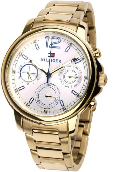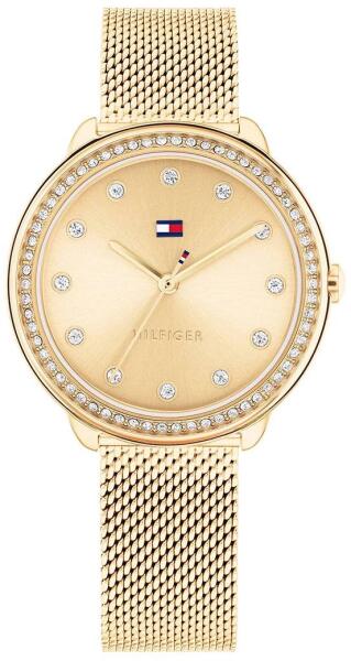 A Tommy Hilfiger Demi női karóra TH1782699 karóra házának anyaga Nemesacél, színe Arany, a szíjának anyaga Nemesacél és a színe Arany. Az óratok átmérője 33 mm, alakja Kerek. A karóra üvege Kristály (nehezen karcolható), szerkezete Kvarc és vízállósága 3 atm (30m) (cseppmentes).