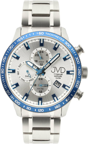 A JVD márka műhelyéből származó férfi óra örömet okoz minden olyan férfinak, aki kedveli a kronográfokat és a minőségi divatkiegészítőket. Három többfunkciós al-számlap ábrázolja a hét napját és kettős időt. Ezen kívül tartalmaz dátumkijelzőt, jellegzetes indexeket és lumineszcens mutatókat.