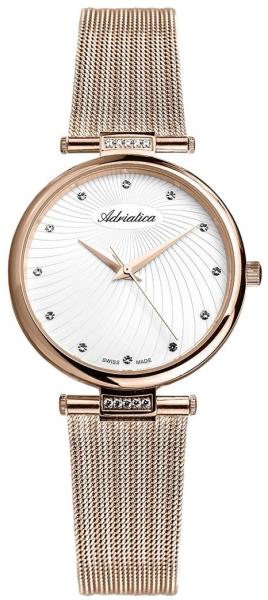 Gyönyörű női Adriatica modell a Milano kollekcióból - rózsaarany színű, PVD bevonatos, rozsdamentes acél tokkal és csattal. Működéséről a rendkívül megbízható, svájci Ronda 763 kvarc szerkezet gondoskodik. Számlapja kövekkel díszített, anyagában mintázott.