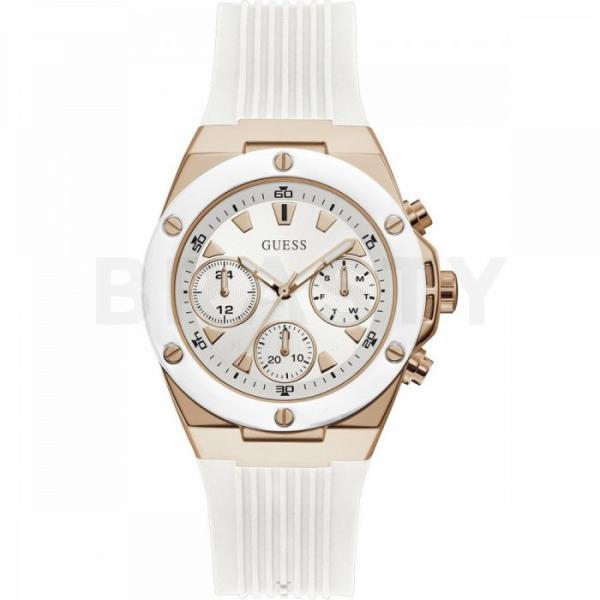 Női Guess GW0030L3 karóra fehér és rózsaarany gyönyörű kombinációjában. Fehér műanyag szíj, amely hosszában dombornyomott. Ez a gyönyörű és divatos darab a Guess egyik legkelendőbb modellje. Az óra fém részei sima és fényes felületűek. Az óra mérete 39 x 10 mm. Ez az egyedi karóra első látásra elvarázsolja Önt. Az arany szín a fehérrel kombinálva még mindig i