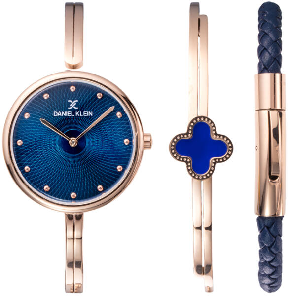 Daniel Klein női karóra ajándék karkötőkkelAz egyik karkötő rózsaaranyszínű, a másik karkötő sötétkék és rózsaaranyszínű A Daniel Klein óramárkát 1998-ban alapították, de egyre növekvő népszerűségnek örvend köszönhetően a kedvező árfekvésének és divatos megjelenésének. Ez nem véletlen, hiszen a cég mottója "Fashion for everyone", vagyis "Divat mindenki