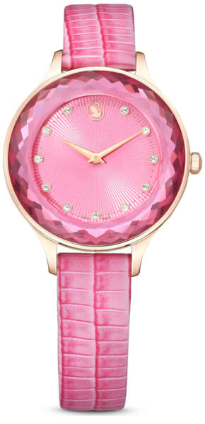A vidám 33 mm-es karóra igazán élénk színfoltot ad megjelenéséhez, hogy megmutathassa legjátékosabb oldalát. A rózsaszín színvilágot rozéarany árnyalatú kivitelezéssel kombinálja, míg az aprólékos kidolgozású lünetta és óraüveg egy darab 72 fazettás zafír kristályból készült. A rózsaszín gilosmintás óralap kristály beosztású, kecses hattyú motívummal 12