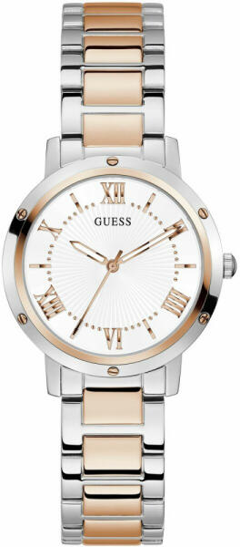 Fogadjon az egyedi női Guess GW0404L3 órára, amely egyszerűen feldobja a ruhatárát. Az ezüst és a rózsaarany kombinációja tökéletesen megteremti ennek a modellnek az eredeti kialakítását. A tartós tok fehér kijelzőt rejt, amely római számokkal és indexekkel ellátott számlapjával büszkélkedhet. A láncszemes szíj kellemesen sima tapintású, így az óra egész nap kény