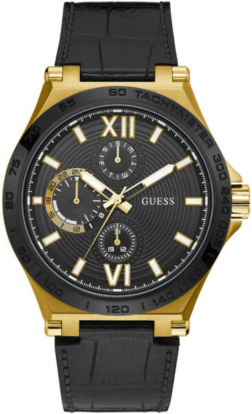 Eredeti Doboz, Pontos óraszerkezet , Kiváló minőségű anyagok, kifinomult tervezés 2év Magyar jótállás, 15 napos pénzvisszafizetés Guess Renegade férfi óra karóra Multifunctional GW0204G1 nemesacél tok, arany és fekete bevonat, csiszolt / matt bőr szíj, fekete, tűzött szij Quartz szerkezet, elemes naptári nap kijelző, dátumkijelzés, 24 órás kijelző 50 méter vízállós