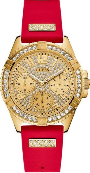 Leírás: Megnevezés (kinek): NőiMárka: GuessStílus: DivatosVízálló: 30 mSzíj színe: pirosSzíj anyaga: szilikonSzámlap színe: Arany strasszokkalSzámlap: AnalógMozgás: kvarc akkumulátorÜveg: ÁsványiTest/tok: acélA tok színe: aranyÓra alakja: kerekSzíj szélessége: 18 mmA ház átmérője: 32 mmGarancia: 2 év