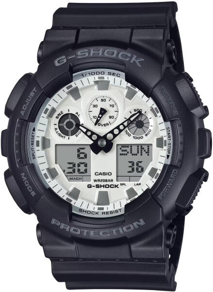 Casio GA-100WD-1AER Férfi Karóra - G-ShockA Casio GA-100WD-1AER férfi karóra a G-SHOCK sorozat letisztult, mégis robusztus modellje, amely a matt fekete és fényes fehér kontrasztjával tűnik ki. Ez a strapabíró karóra 20 bar vízállósággal, ütésálló kialakítással, mágneses ellenállással, és LED világítással rendelkezik, így ideális választás mindennapi használatra