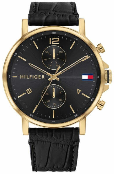 Leírás: Cél (kinek): Férfiak Márka: Tommy Hilfiger Stílus: Elegáns Vízállóság: 50 m Szíj színe: fekete Szíj anyaga: bőr Számlap színe: fekete Számlap: Analóg Mozgás: Kvarc elem Üveg: Ásványi Test/tok: acél A tok színe: arany Óra alakja: Kerek Szíj szélessége: 22 mm A ház átmérője: 44 mm Garancia: 2 év Súly: 64 g