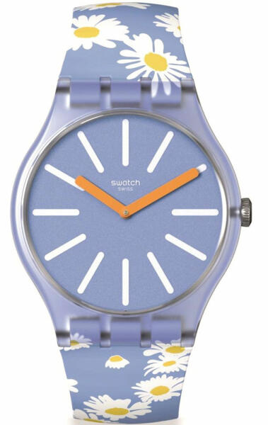 Swatch Dazed By Daisies unisex karóra SO29S100 egy kerek formájú, kék színű bio műanyag óratokkal, kék analóg számlappal és színes szilikon szíjjal rendelkező divatos Swatch karóra. Az óra elemmel működő kvarc szerkezettel és 3 ATM vízállósággal rendelkezik, tehát cseppálló. Ez a fantasztikus óra most 33900 áron megrendelhető webshopunkban, melyre 24 hónap garanciá