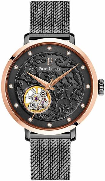 Automata felhúzású, mechanikus női karóra. Anyaga 100% rozsdamentes acél antracit színű PVD bevonattal. "Open heart" eolia számlap. Bicolor antracit és rozé arany színű 3 részes tok, gyönyörű polírozással és matt fénnyel. Megbízható másodperc stoppos Seagull automata szerkezet. Magas minőségű rozsdamentes fém szíj biztonsági zárral. Átlátszó üveg hátlap. Egyedi