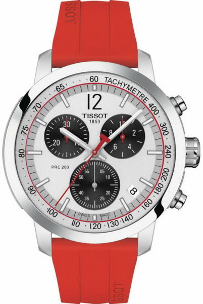 Tissot PRC 200 Chronograph férfi karóra T114.417. 17.037. 02 egy kerek formájú, ezüst színű nemesacél óratokkal, ezüst analóg számlappal és piros szilikon szíjjal rendelkező sportos Tissot karóra. Az óra elemmel működő kvarc szerkezettel és 20 ATM vízállósággal rendelkezik, tehát búvárkodásra megfelelő. Ez a fantasztikus óra most 209900 áron megrendelhető webshopun
