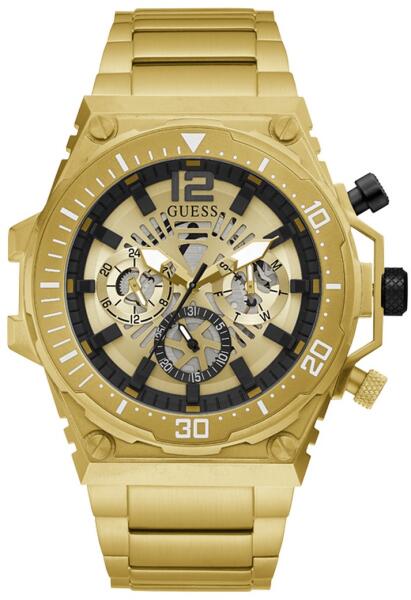 Guess Exposure férfi óra karóra Multifunctional GW0324G2 nemesacél tok, arany bevonat, matt nemesacél szíj, arany bevonat, matt, összecsukható kapocs Quartz szerkezet, elemes naptári nap kijelző, dátumkijelzés, 24 órás kijelző 50 méter vízállóság számlap szín fekete / arany ház szélesség around 54 mm tok magasság around 12 mm díszdobozzal és information kártya. For env