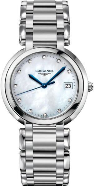 A Longines Primaluna női karóra L8.114. 4.87. 6 karóra házának anyaga Nemesacél, színe Ezüst, a szíjának anyaga Nemesacél és a színe Ezüst. Az óratok átmérője 34 mm, alakja Kerek. A karóra üvege Zafír (karcolásmentes), szerkezete Kvarc és vízállósága 3 atm (30m) (cseppmentes). L263 kvarc szerkezet 11 Top Wesselton VS-SI gyémánt (0.044 ct)