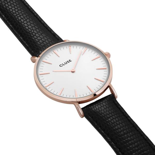 Divat Cluse karórák a La Boheme kollekcióból. Ideális kiegészítők nőknek , akik előnyben részesítik az analóg és kerek alakú karórákat. A belül ellenálló 8 mm magas tokban, melyet minőségi sárgaréz alkot , megbízható elemes (quartz) gépezetet talál, mely 38 mm átmérőjű számlapot működtet. A számlapot ellenálló ásványi üveg véd. A tok rózsaarany, számlap
