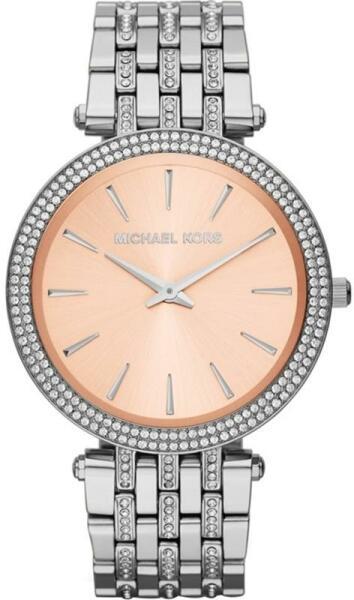 Divat Michael Kors karórák a Darci kollekcióból. Ideális kiegészítők nőknek , akik előnyben részesítik az analóg és kerek alakú karórákat. A belül ellenálló 8 mm magas tokban, melyet minőségi acél alkot , megbízható elemes (quartz) gépezetet talál, mely 39 mm átmérőjű számlapot működtet. A számlapot ellenálló ásványi üveg véd. A tok ezüst, számlap rózsas
