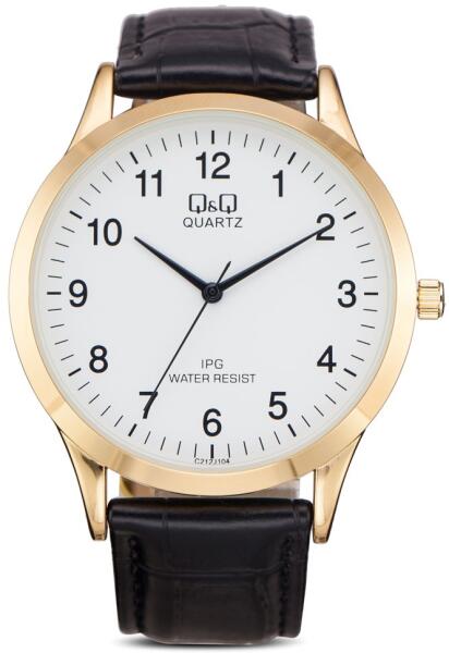 Márka: Q&Q | Kollekció: STANDART | Modell: C212J104Y | Garancia: 2 évek | Szín: fekete | Tok színe: arany árnyalat | Táplálás: elem | Szíj anyaga: bőr | Vízálloság: 30M/3ATM | Üveg: ásványi | Forma: kerek | Csatolás típusa: standard felcsatolás | Számjegyek a számlapon: arab | Rendeltetés: férfi | Minimális kerület: 16 | Termék típusa: karórák | Típus: analóg |